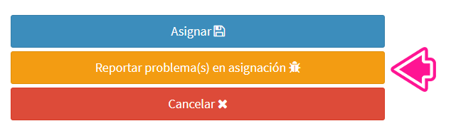 Debes ingresar al módulo de asignación de cursos en línea y dirigirte hasta la parte inferior en donde se encuentran las acciones que puedes realizar, deberás dar clic en el botón Reportar problema(s) en asignación (botón color naranja)