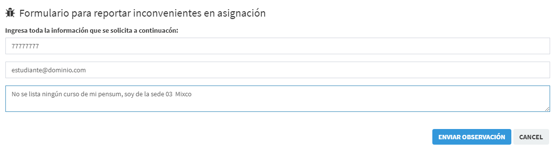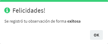 Una vez ingresada toda la información, haz clic en el botón Enviar Observación, se mostrará una alerta en la que se solicita tu confirmación para enviar el reporte de problemas, deberas dar clic en Aceptar