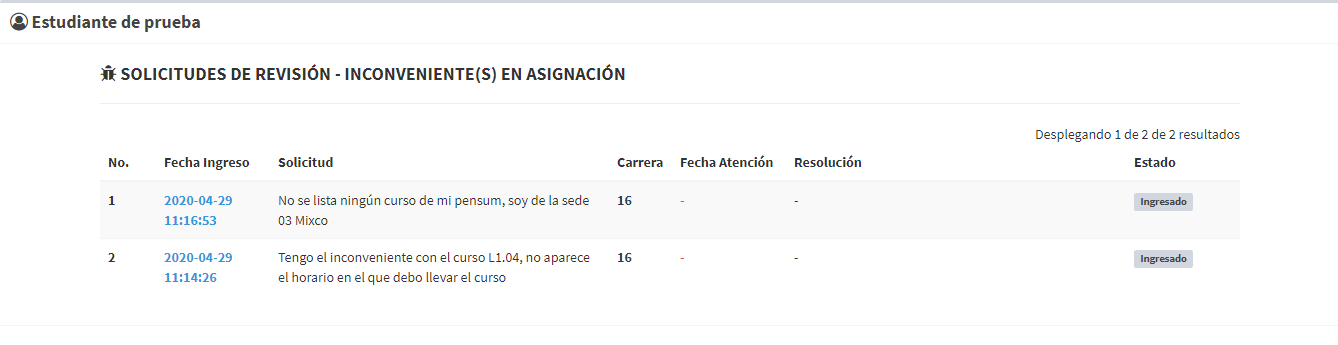 Al dar clic en el botón Ok, se mostrará el listado de solicitudes de revisión o reporte de inconvenientes que has realizado, así como el estado en el que se encuentran