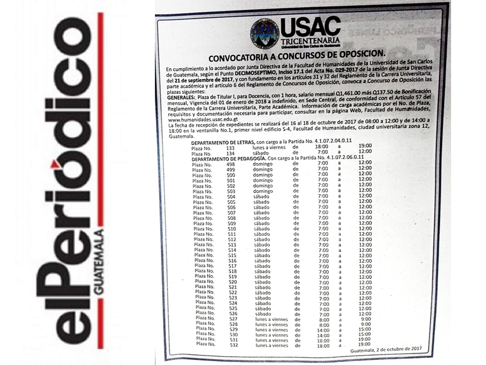 En cumplimiento a lo acordado por Junta Directiva de la Facultad de Humanidades de la Universidad de San Carlos de Guatemala, según el punto DÉCIMO SÉPTIMO, del Acta 29-2017 de la sesión extraordinaria del 21 de septiembre de 2017, con fundamento en los artículos 31 y 32 del Reglamento de la Carrera Universitaria, Parte Académica y el artículo 6 del Reglamento de Concursos de Oposición, convoca a: Concurso de Oposición las siguientes plazas. [/dt_sc_pullquote]